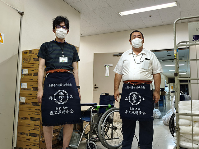 大田区立特別養護老人ホーム蒲田で活動を行い、車椅子2台のタイヤチューブ交換や簡単な清掃を行いました。